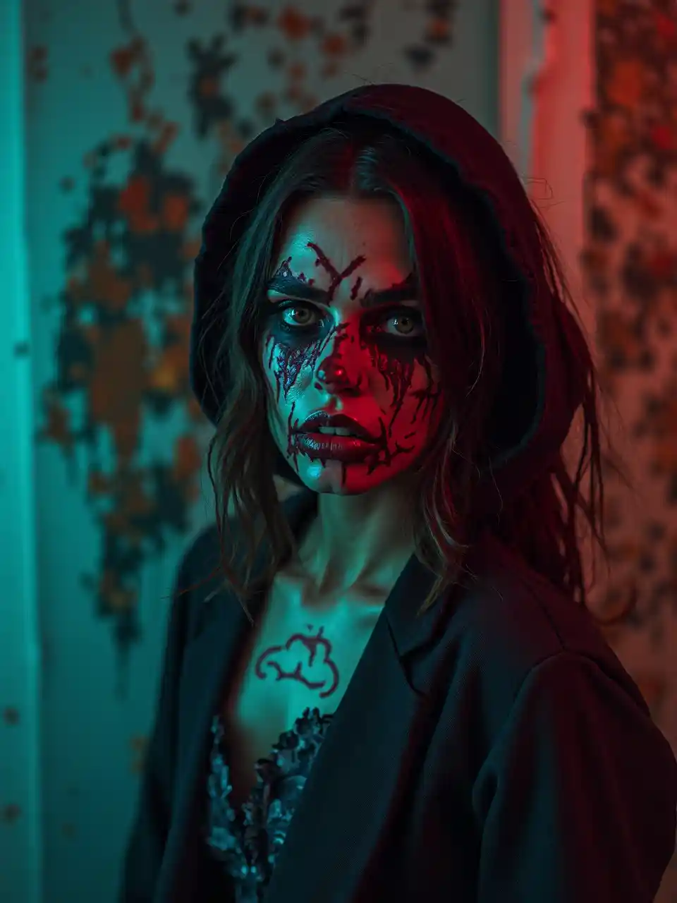 Η Αλεξάνδρα Νταδάριο ως ένας κακός χαρακτήρας φορώντας μια ανατριχιαστική στολή για το Χάλοουιν, με ζωντανά κορεσμένα χρώματα, με χρώμα αντίθεση