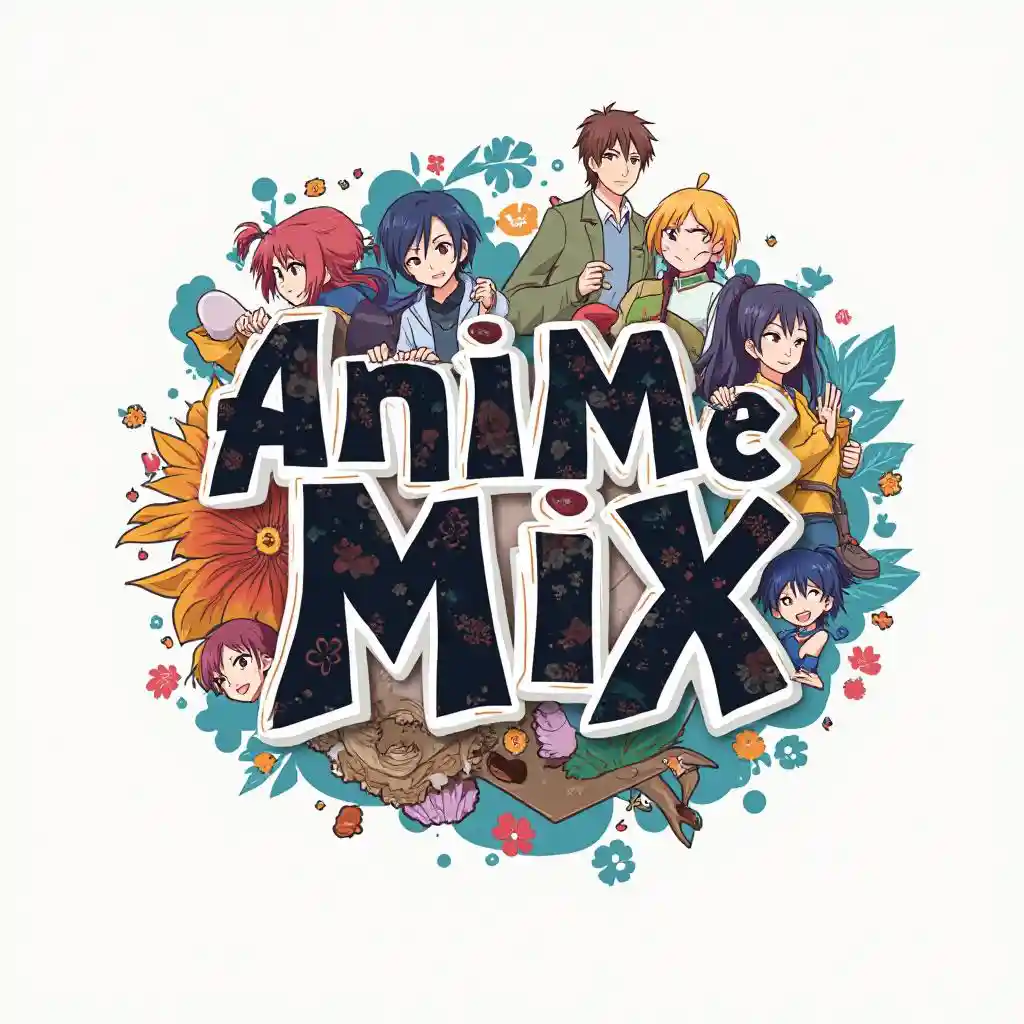 Σχεδιασμός λογότυπου με τις λέξεις Anime Mix γραμμένες μέσα του, με την προσθήκη εικόνων από anime series