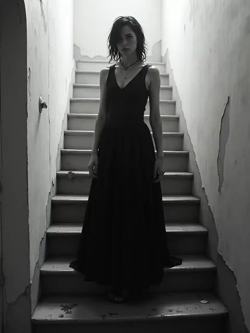 Δημιουργήστε μια φωτογραφία μιας φανερωτικής εμφάνισης της Άννας Μπολέιν στα σκαλιά της μεγάλης σκάλας, μελαχρινές μαύρες μούσκεμα μαλλιά. Σκοτεινό αποκρυφιστικό τρόμο με βρώμικο ντίζελ πανκ στυλ. Υπερφυσικός τρόμος. Εφιάλτες από το απόκρυφο.