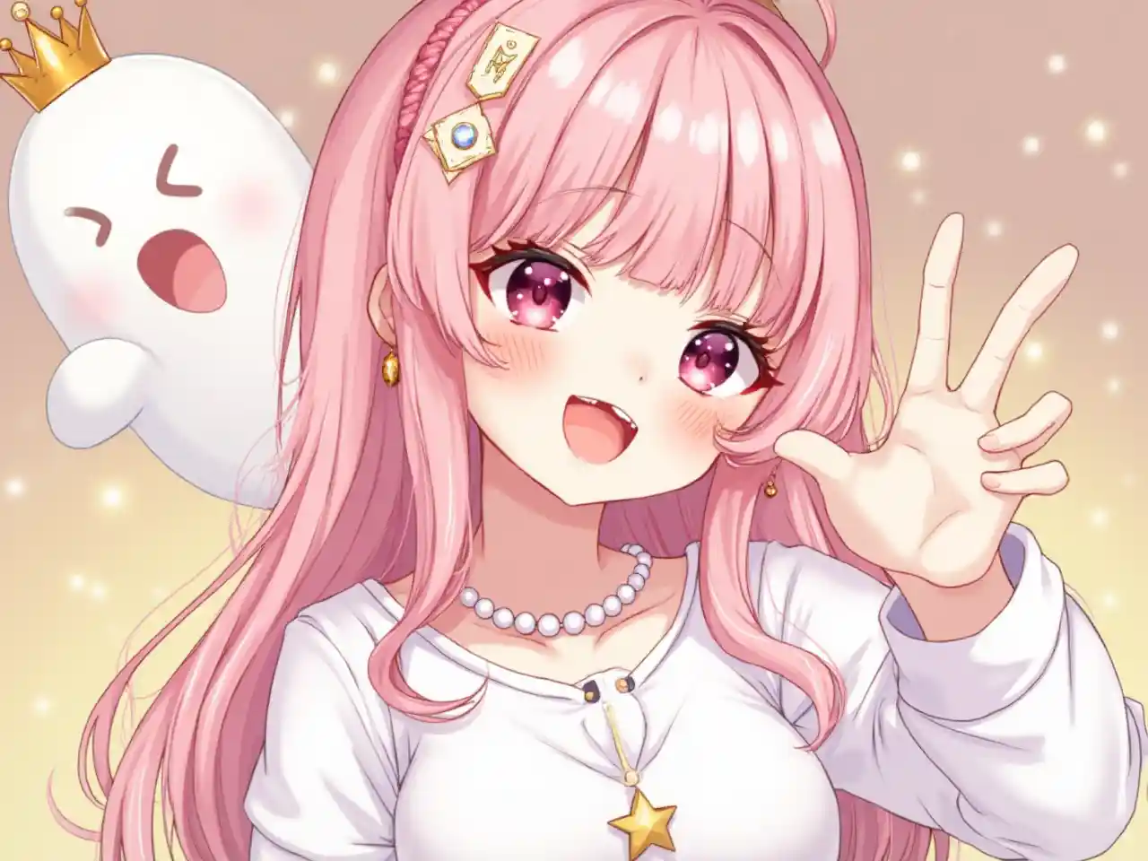 αριστούργημα, καλύτερη ποιότητα, υψηλής ποιότητας, ζωντανά χρώματα, υψηλή αντίθεση, απαλές και μαλακές κλίμακες, στυλιζόμενος ρεαλισμός, λεπτομέρειες σαν καρτούν, ονειρικό, 1girl, κοσμήματα, στέμμα, κολιέ, σκουλαρίκια, χαμόγελο, ανοιχτό στόμα, φάντασμα, ροζ μαλλιά, μακριά μαλλιά, σόλο, βλέποντας το, λευκό πουκάκι, blush, :d, shirt, star (σύμβολο), mini crown, hand up, pearl necklace, teeth, pink eyes, red hair, band, warm colors, vibrant colors, high contrast, smooth & soft gradients, stylized realism, cartoon-like details, dreamy, 1girl, jewelry, crown, neck, earrings, smile, open mouth,:d, pink hair, long, solo, looking at bang, white shirt, blush, star, (α) μαργαριταρό κολιέ, δόντια, ροζ μάτια, κόκκινα μαλλιά, ζεστά χρώματα