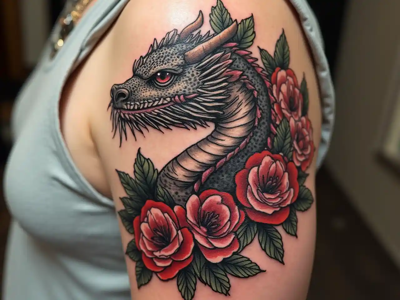 Ένα παραδοσιακό τατουάζ ενός γενειμένου δράκου τυλιγμένο σε τριαντάφυλλα και λουλούδια.