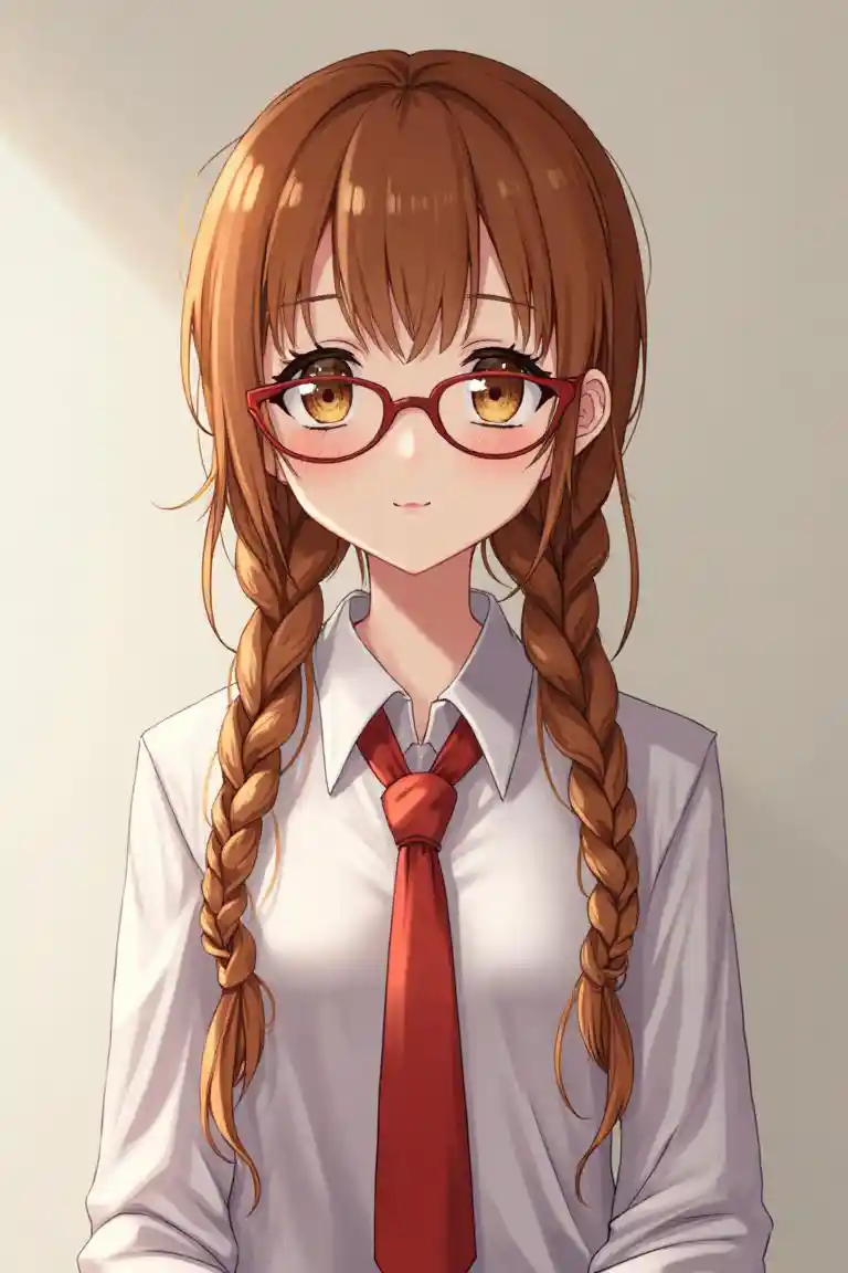 Το κορίτσι με τις δύο μεγάλες πλεξίματα, λίγο νέα, τα μαλλιά μέχρι τη μέση, τα μάτια είναι πορτοκαλί, χρώμα μαλλιών, κόκκινα γυαλιά, λευκή μπλούζα, μια κόκκινη γραβάτα με ελαφία