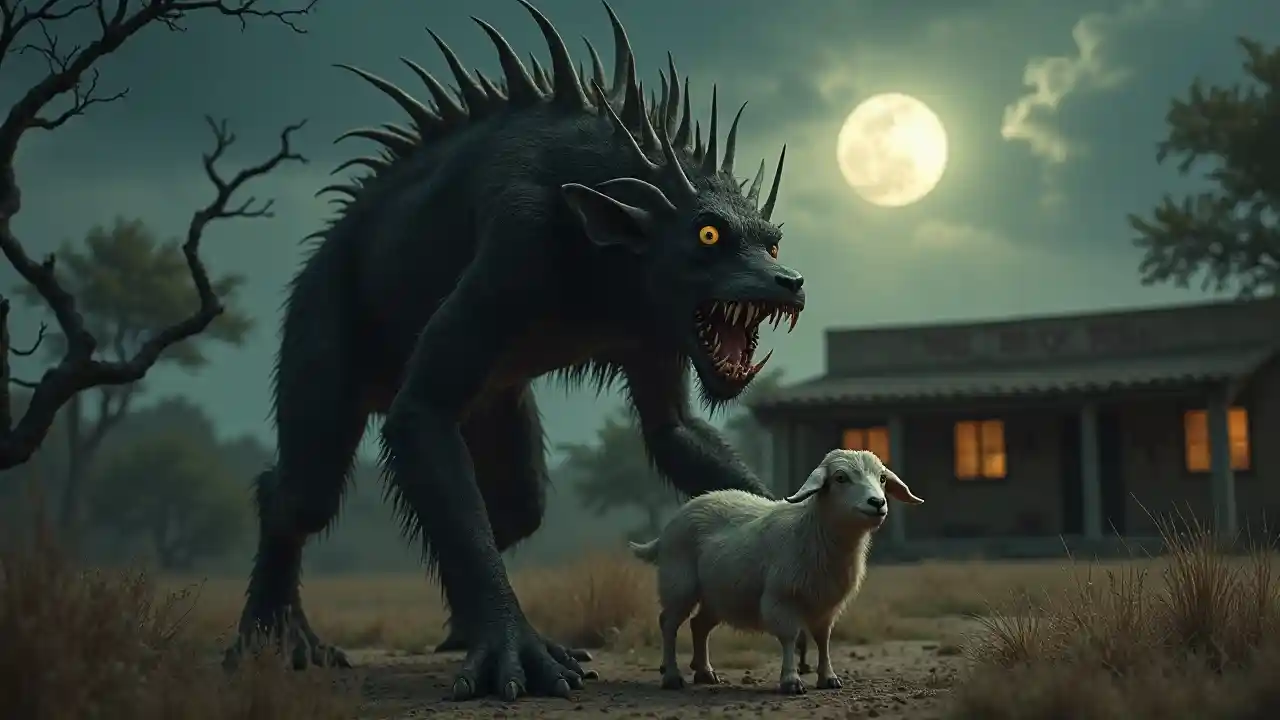 Ανθρωπομορφικός Τσουπακάμπρα κρυπτίδας με φαύλα δόντια και μακριά δόντια τρώει μια κατσίκα, επιμήκη κίτρινα μάτια, μικρή σκούρα γούνα με σπονδύλια σαν χαμούν, πίσω, μεξικανικό αγρόκτημα με παλιά δέντρα, πλήθος, κανόνας των τριών, ρεαλιστική φωτογραφία