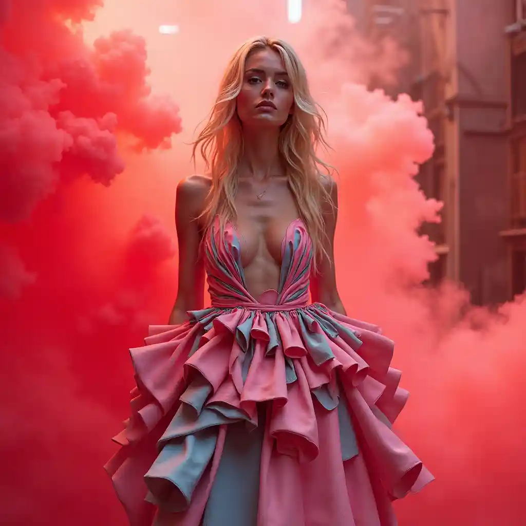 Φουτουριστική φωτογραφία μόδας που απεικονίζει μια ξανθιά γυναίκα σε μια κοσμική φούστα με περίπλοκες και κομψές λεπτομέρειες, χρησιμοποιώντας τολμηρά γεωμετρικά σχήματα και εντυπωσιακές γωνίες. Η σκηνή περιβάλλεται από ένα γελοίο κόκκινο καπνό, δημιουργώντας μια υπερμαξιμαλιστική ατμόσφαιρα γεμάτη με ζωντανά χρώματα και περίπλοκες λεπτομέρειες. Η σύνθεση επικεντρώνεται στη χρήση παστέλ με υψηλή έννοια, ενισχύεται από καινοτόμα φωτιστικά εφέ για να αναδείξει τα υπερλεπτά στοιχεία, με αποτέλεσμα μια πρωτοποριακή και δυναμική εικόνα.
