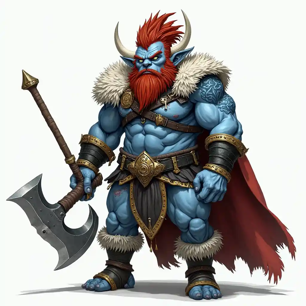 Από το βασίλειο των νεράιδων και της φαντασίας. Ένα όμορφο troll με ανοιχτό μπλε δέρμα σαν Στρουφ. Πολεμιστής. Χρησιμοποιεί ένα γιγαντιαίο πολεμικό τσεκούρι. Μεγάλος, δυνατός, με μεγάλα μυς, μυώδης, με πλάγια στήθη, με στενή μέση, bodybuilder. Κοντά, κόκκινα μαλλιά, μεσαία μανία. Λευκά κέρατα βόδι κυρτό προς τα πάνω από το μπροστινό μέρος των δεινών του. Όμορφο ανδρικό τραχύ πρόσωπο, παγωμένα μπλε μάτια, ισχυρό μέτω και σαγόνι. Μαύρο κόκκινο μούσι, κομμένο με παξιμάδια. Χρυσά καμαρίκια με μαύρα πάνω στους ώμους. Μαύρο δερμάτινο σχοινί στο στήθος του, σκούρα μπλε τατουάζ στο στήθος του. Μαύρα δερμάτινα σιδεράκια σε δυνατά χέρια. Λευκή γούνα που καλύπτει την περιφέρεια του, εκθέτοντας ισχυρά μυώδη πόδια, μια χρυσή ζώνη με μαύρη κορδέλα γύρω από τη μέση του. Μαύρες δερμάτινες μπότες με λευκό χτένισμα. Μια κόκκινη-κόκκινη μικρή κάπα με χρυσό-κίτρινο σχεδιασμένο Βίκινγκ κοπής. Όλη η στάση του σώματος, τσεκούρι σηκωμένο σε στάση πολεμιστή. Το ΜΑΣΤΕΡΠΕΙΟ