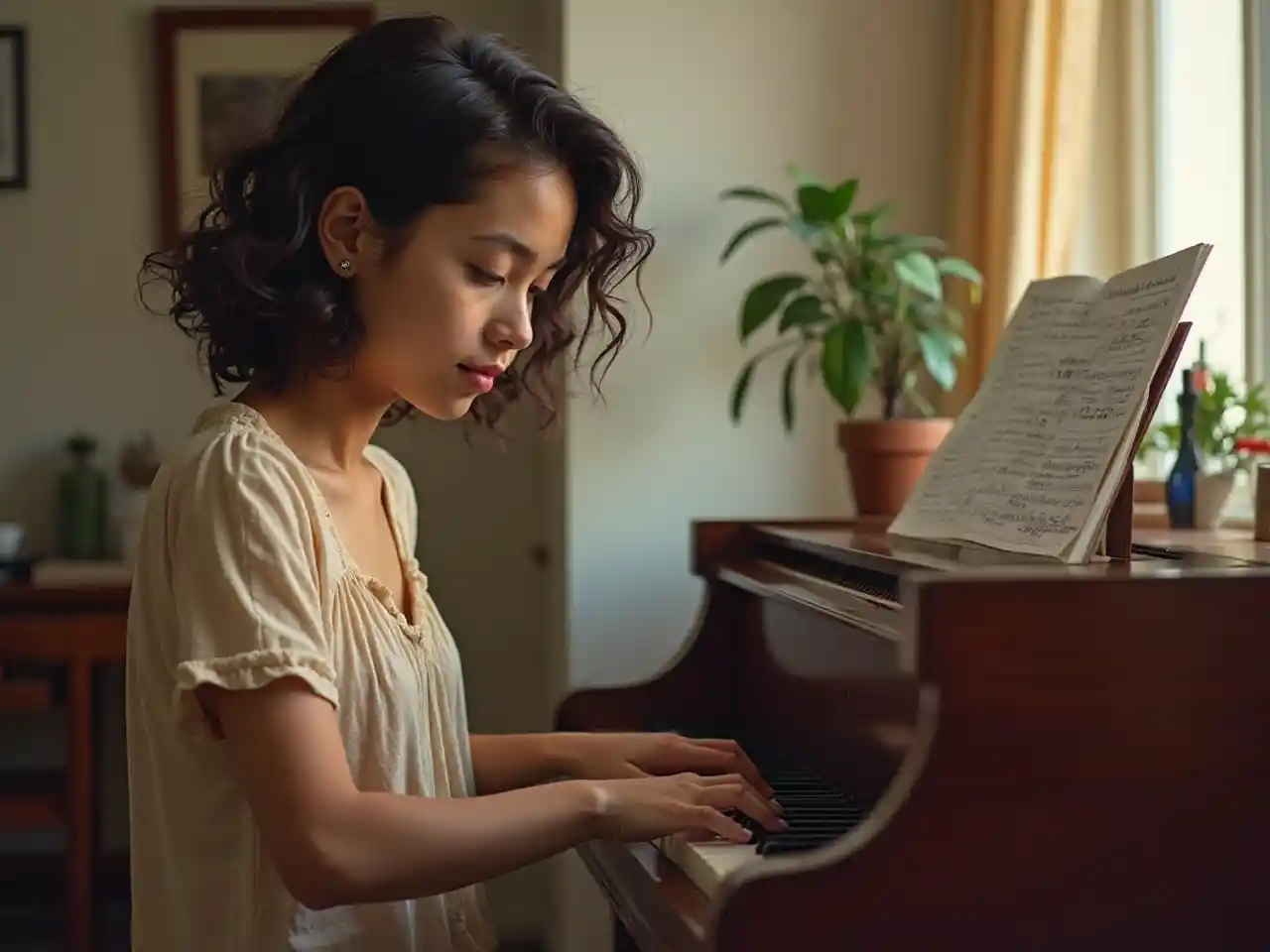 Ένα 25χρονο κορίτσι με ανοιχτό καφέ χρώμα δέρματος, μικρά κυματιστά σκούρα μαλλιά, κάθεται να παίζει πιάνο στο σπίτι του