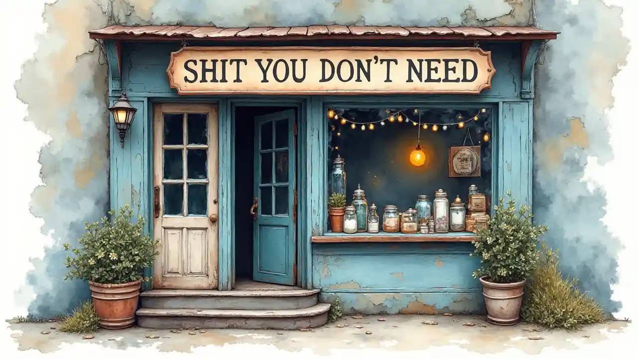 An alcohol ink and watercolor layered artwork of a rustic storefront with a worn and weathered aesthetic. The storefront features two steps leading up to a door with a glass-paneled window, surrounded by old, peeling paint on the frame. A vintage-style sign that extends prominently across the width of the store, detailed in topographic lettering with text that states "SHIT YOU DON'T NEED" and creates a raised, dimensional effect. Muted tones dominate the palette, with soft blues, faded whites, and gentle earthy browns blending seamlessly in a dreamy gradient. The window displays a collection of items—a mix of jars, bottles, candles and small trinkets— along with little twinkle lights hung here and there, brought to life with subtle transparency and flowing textures from the watercolor medium. Shadows and light interplay delicately across the scene, creating a serene, atmospheric quality where every detail feels alive yet subdued.