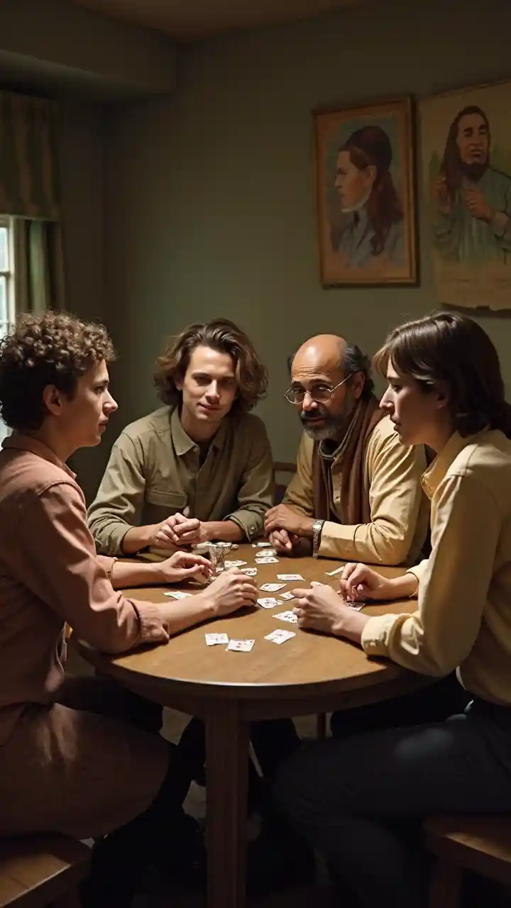 JoannaΦοίβη Μπάφαϊ, Τσάντλερ Μπινγκ, Τζον Λένον, Πολ Μακάρτνεϊ, Μπομπ Μάρλεϊ και Μαχάτμα Γκάντι παίζοντας πόκερ σε ξύλινο τραπέζι, χαλαρή ατμόσφαιρα, ρεαλιστικό στυλ.