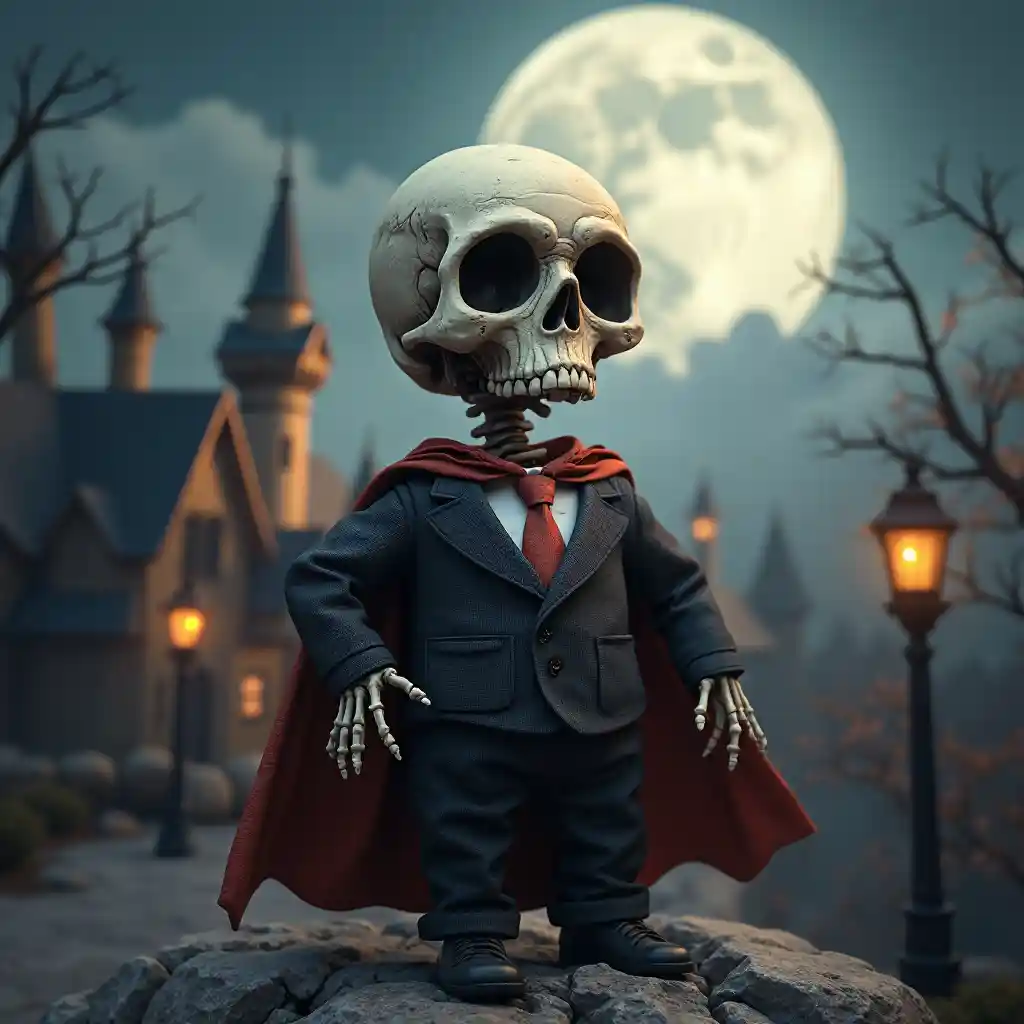 JaceΑγάπηστος σκελετός, φορώντας κοστούμι και κάπα, τρομακτικό κάστρο, πανσέληνος, 3D, HD,