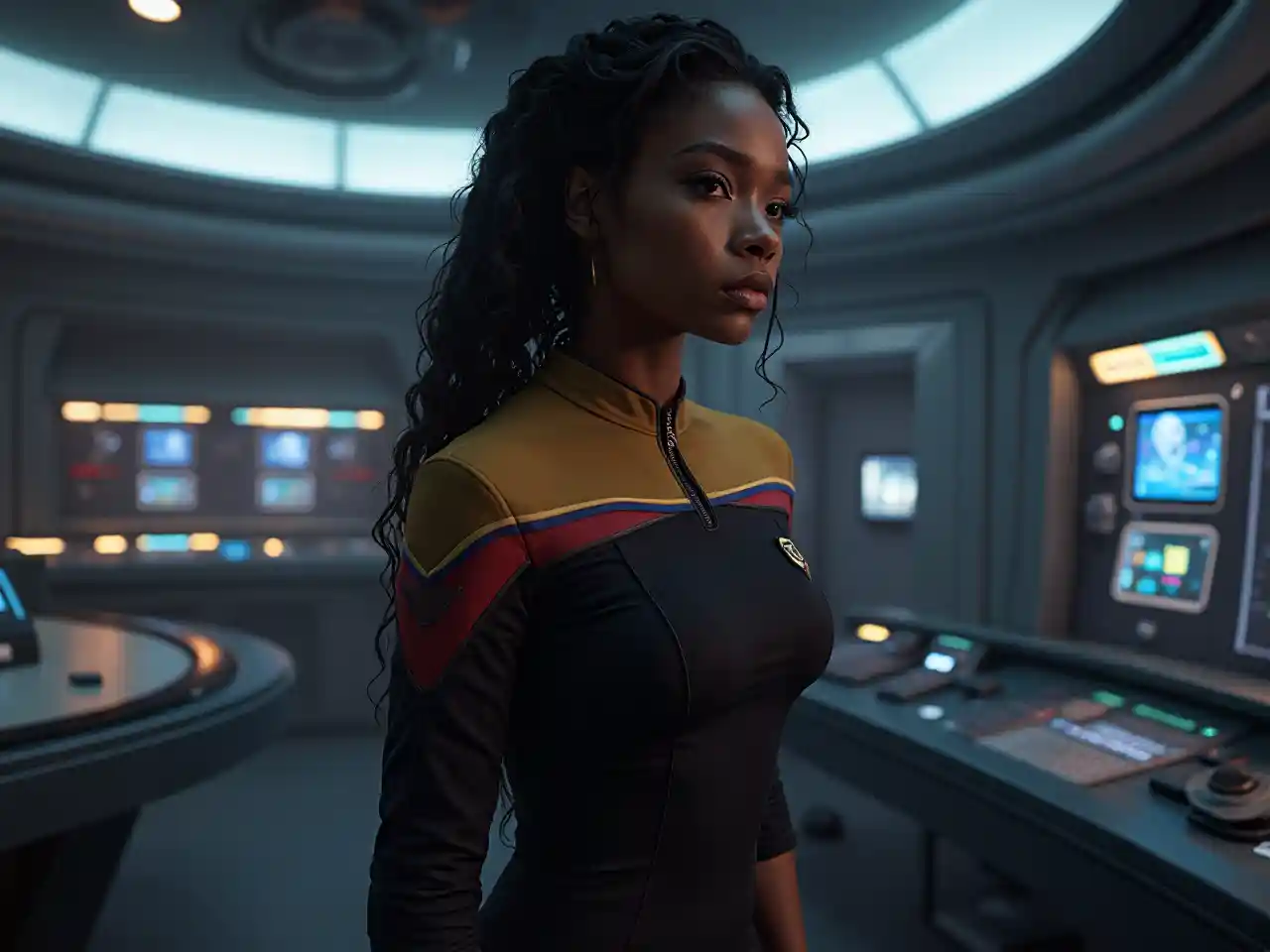 Υπερρεαλιστική εικόνα μιας μαύρης δόκιμης από τον Αστροστόλο στη γέφυρα Εντερπράιζ, με λεπτομερή περιβάλλον και τεχνητό φωτισμό, εμπνευσμένη από το στυλ της Χέδερ Μπικάν. Η σκηνή αποτυπώνει την προηγμένη τεχνολογία και την ατμόσφαιρα ενός Star Trek, εστιάζοντας στην ακρίβεια και την ακεραιότητα στην ανατομία. Η σύνθεση αποφεύγει μακρά ή επιπλέον ανατομία και διατηρεί αναλογικά χαρακτηριστικά, που παρουσιάζονται σε κινηματογραφική αναλογία 3: 2. Μικρές δημιουργικές πινελιές προσθέτουν μοναδικότητα, ενώ παραμένουν πιστές στην κεντρική ιδέα.
