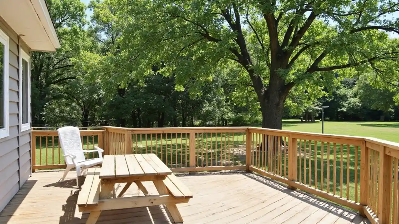 Μια ηλιόλουστη πίσω αυλή με ξύλινο κατάστρωμα, τραπέζι πικνίκ, λευκή καρέκλα και ένα μεγάλο δέντρο.