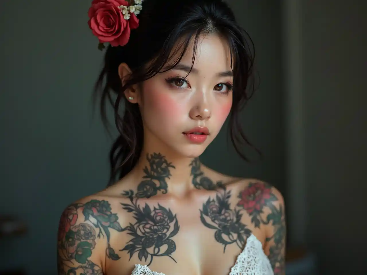 Νεαρή όμορφη κορεάτισσα μοντέλο τατουάζ, χαριτωμένο τατουάζ σε όλο το σώμα, υπερρεαλιστική, φωτορεαλιστική, αριστούργημα, βραβευμένη φωτογραφία