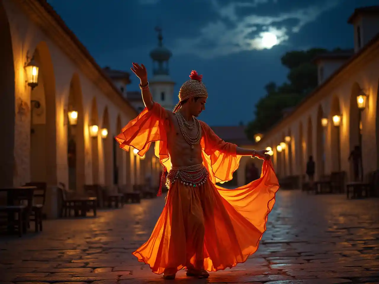 Εκτελώντας έναν πολιτιστικό χορό σε μια πλατεία με φεγγάρι, ένας λευκός άνδρας γύρω στα 20 λάμπει σε ένα ζωντανό κοστούμι. Φανάρια και πέτριες καμάρες τον περιβάλλουν, οι δυναμικές κινήσεις του και η νεανική ενέργεια του εκπέμπουν πολιτιστική υπερηφάνεια και εορταστική γοητεία σε ήσυχο ιστορικό περιβάλλον.