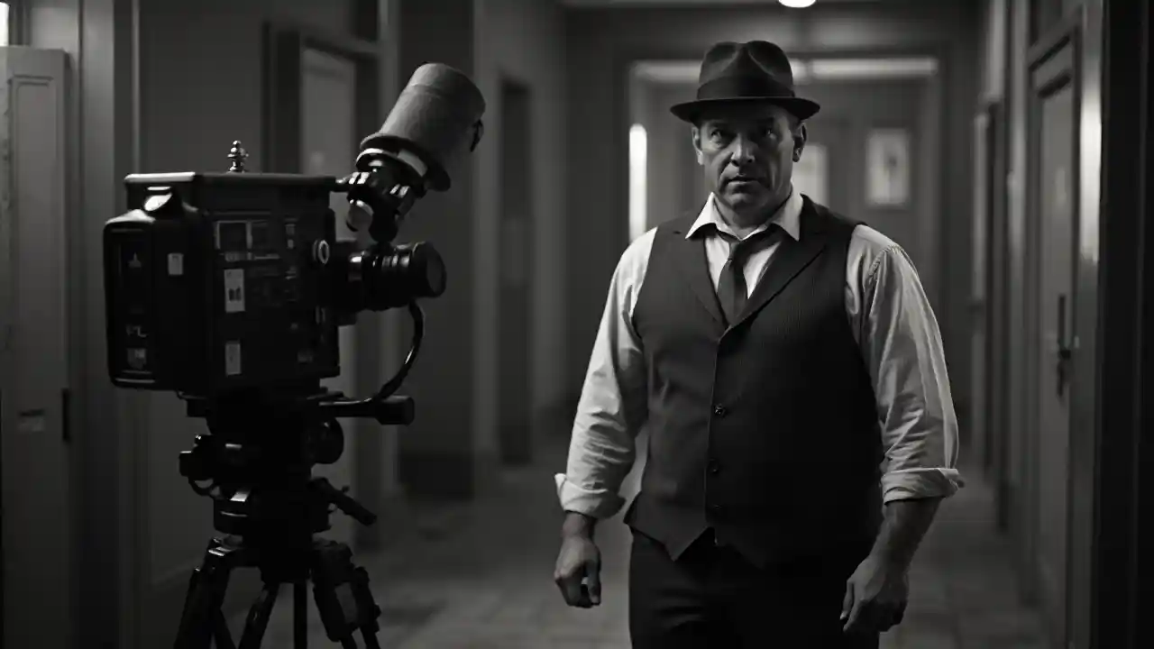 Ο Στίβεν Γκράχαμ, φορώντας μια καπέλα, καθαρά ξυρισμένος, ντυμένος με γιλέκο και παντελόνια, στέκεται δίπλα σε μια 35mm κινηματογραφική κάμερα σε ένα κινηματογραφικό, 1940 ταινία noir, σοβαρή εμφάνιση,