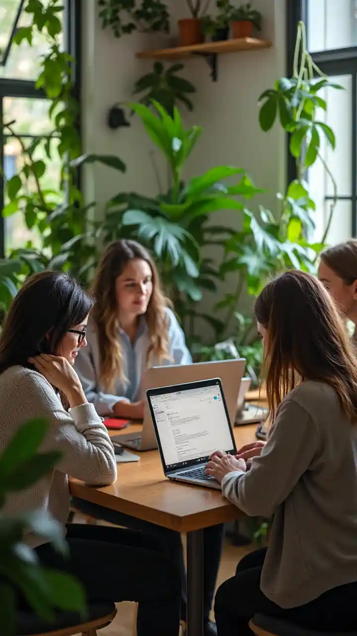 Γυναίκες που δουλεύουν σε φορητούς υπολογιστές γύρω από ένα ξύλινο τραπέζι σε ένα δωμάτιο γεμάτο φυτά