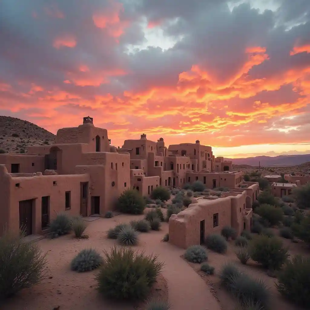 Pueblos de Adobe en Nuevo México que reflejan la paleta de puestas de sol.