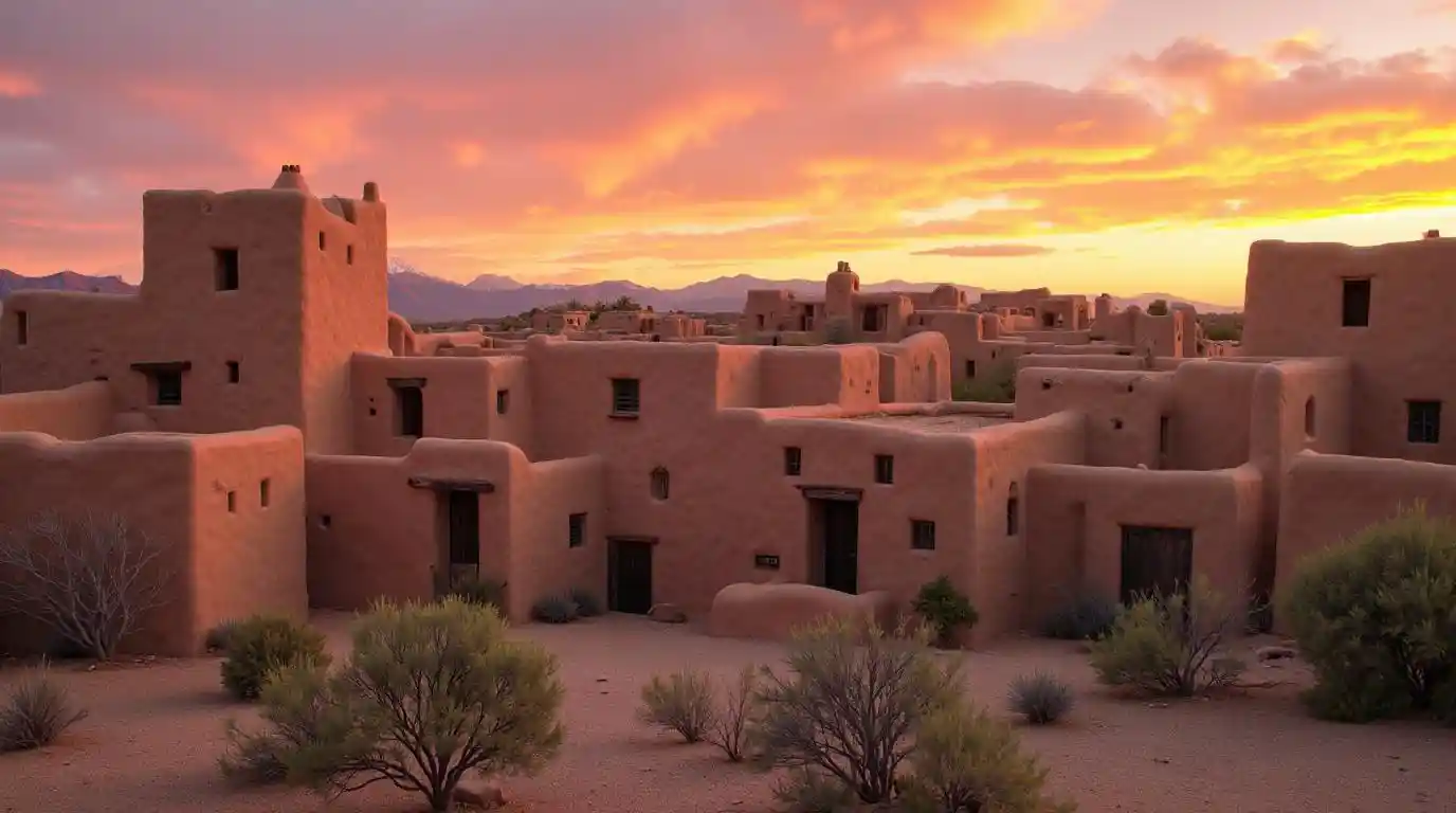 Pueblos de Adobe en Nuevo México que reflejan la paleta de puestas de sol.
