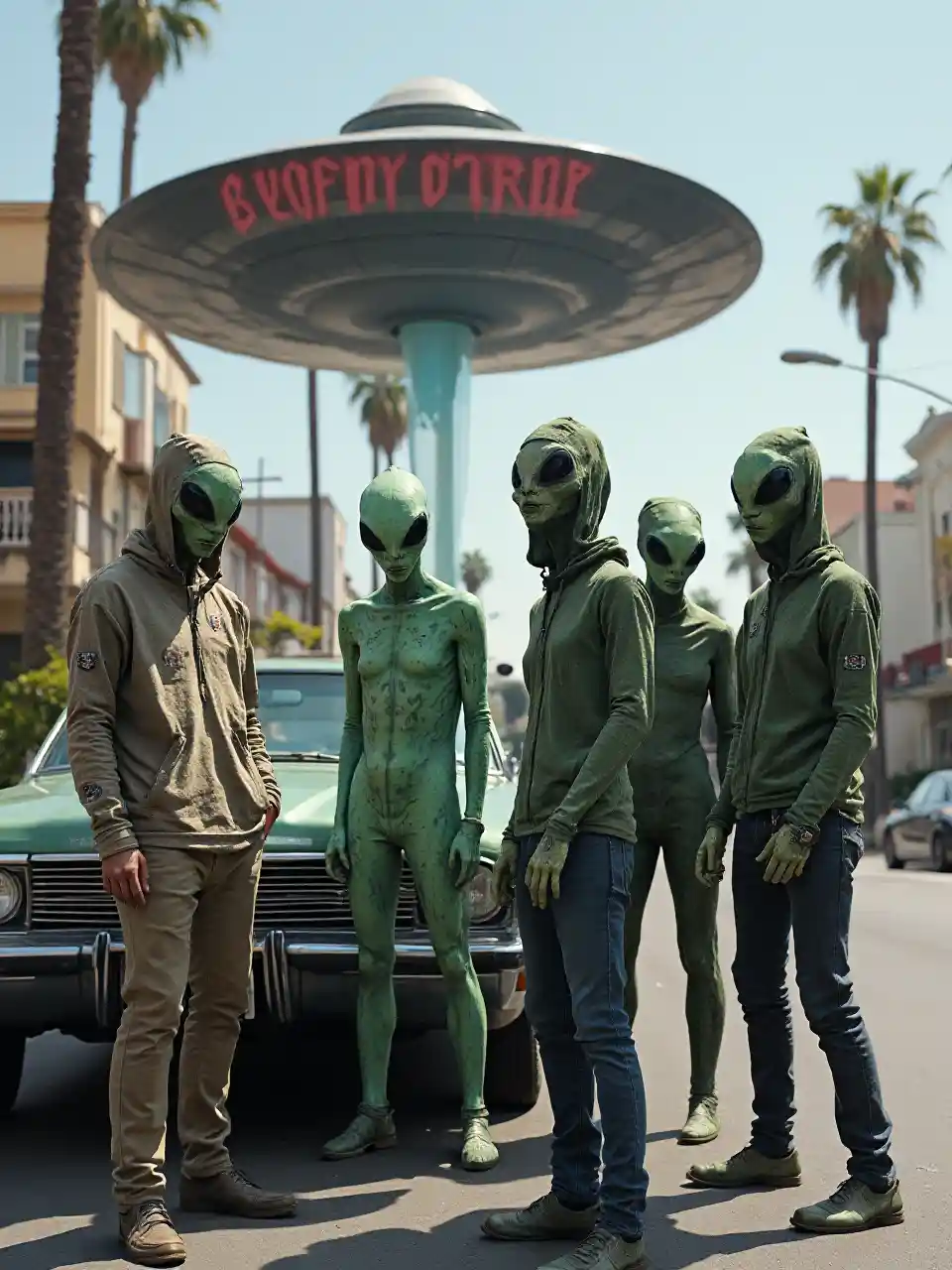 Extraterrestres vestidos con ropa de ganster en Los Ángeles etiquetando las palabras ALIEN GANG en todo Los Ángeles con ovnis estacionados en la calle