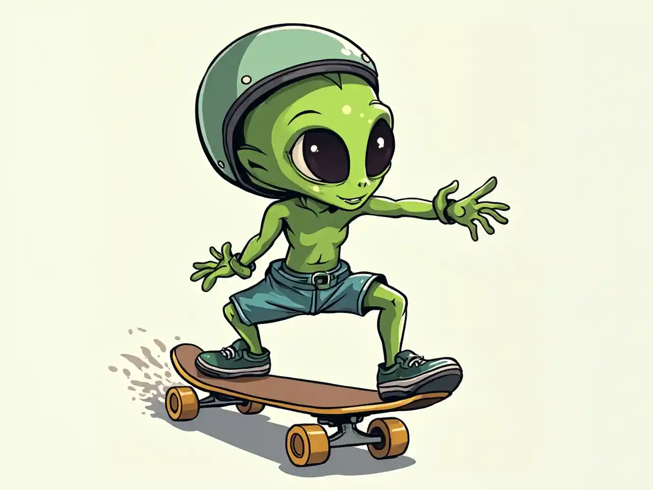 crear una imagen de un extraterrestre verde en una patineta, tiene grandes ojos ovalados, lleva casco y está haciendo una maniobra, estilizado, vectorizar el dibujo, en tamaño A3 y 300 DPI, sin fondo