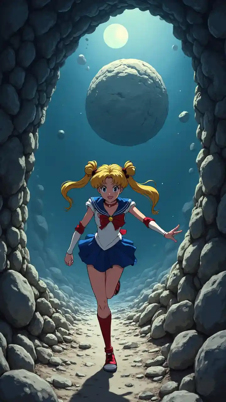 Laylaami mizuno (luna marinera), huyendo de una roca perseguidora en una tumba después de recuperar su varita de mercurio robada
