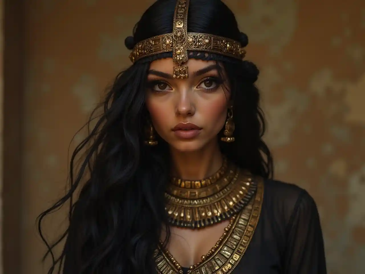 Lukehermosa reina del antiguo Egipto, tela oscura, cabello oscuro, ojos marrones, accesorios para la cabeza