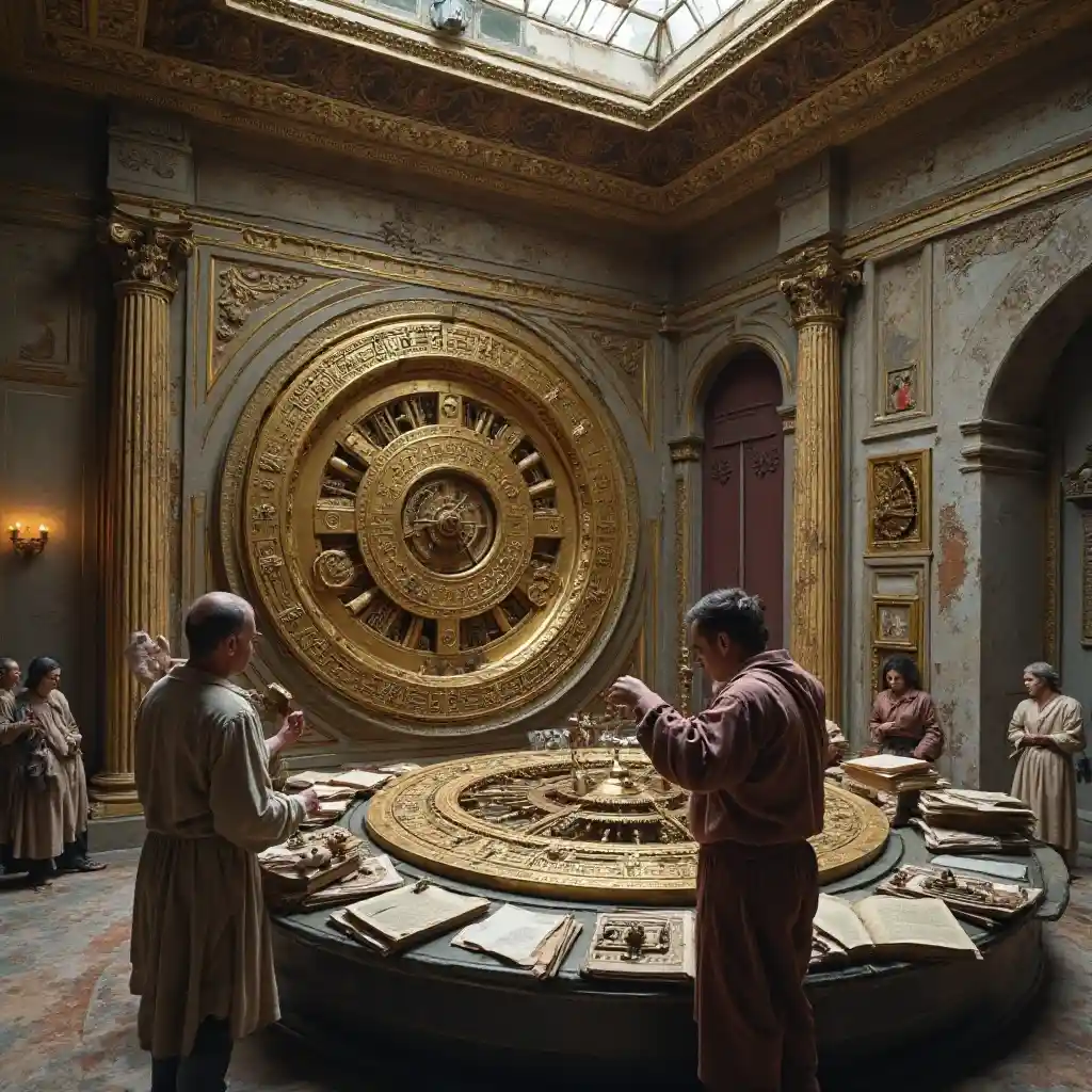JacobAntiguos arquitectos griegos trabajando en el intrincado mecanismo de Anticitera dentro de un lujoso edificio