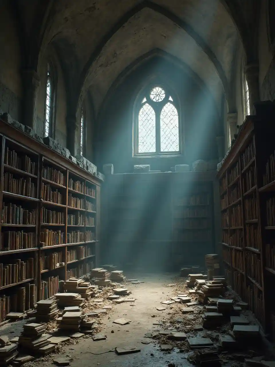 "Antigua biblioteca abandonada, grandes paredes de piedra, ventanas agrietadas, polvo flotando en el aire, filas de viejas estanterías de madera, libros olvidados, atmósfera espeluznante y misteriosa, luz tenue que entra a través de ventanas rotas, aura mágica en el aire, sentido del misterio y la aventura".
