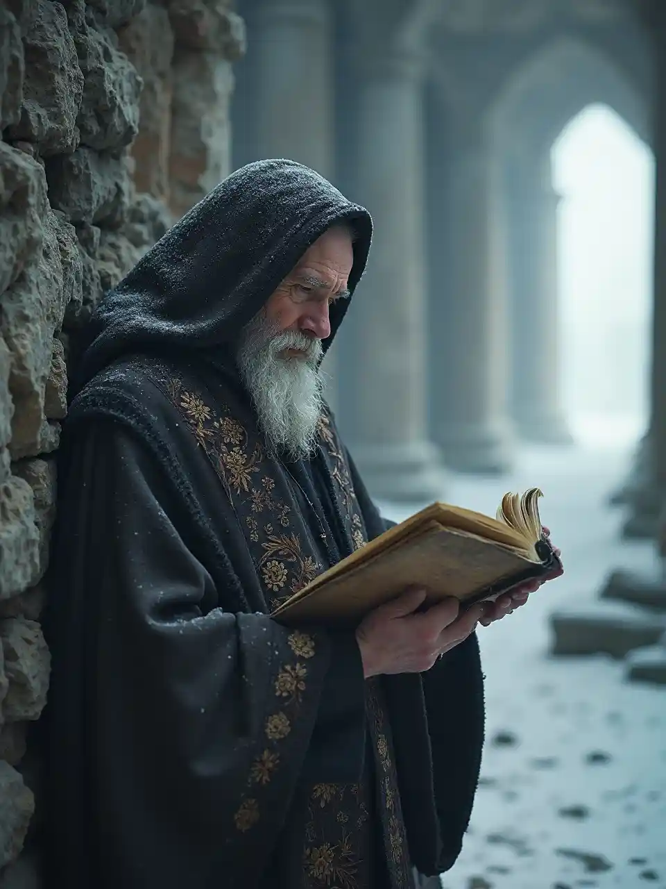 Leyendo runas en una ruina nevada, un hombre europeo de 84 años y barba gris luce un manto con bordados de escarcha. Pilares que se desmoronan y vientos aulladores lo enmarcan, su cuidadoso estudio irradia sabiduría y maravilla mística en una escena histórica cruda. Sus ojos ven verdades antiguas.