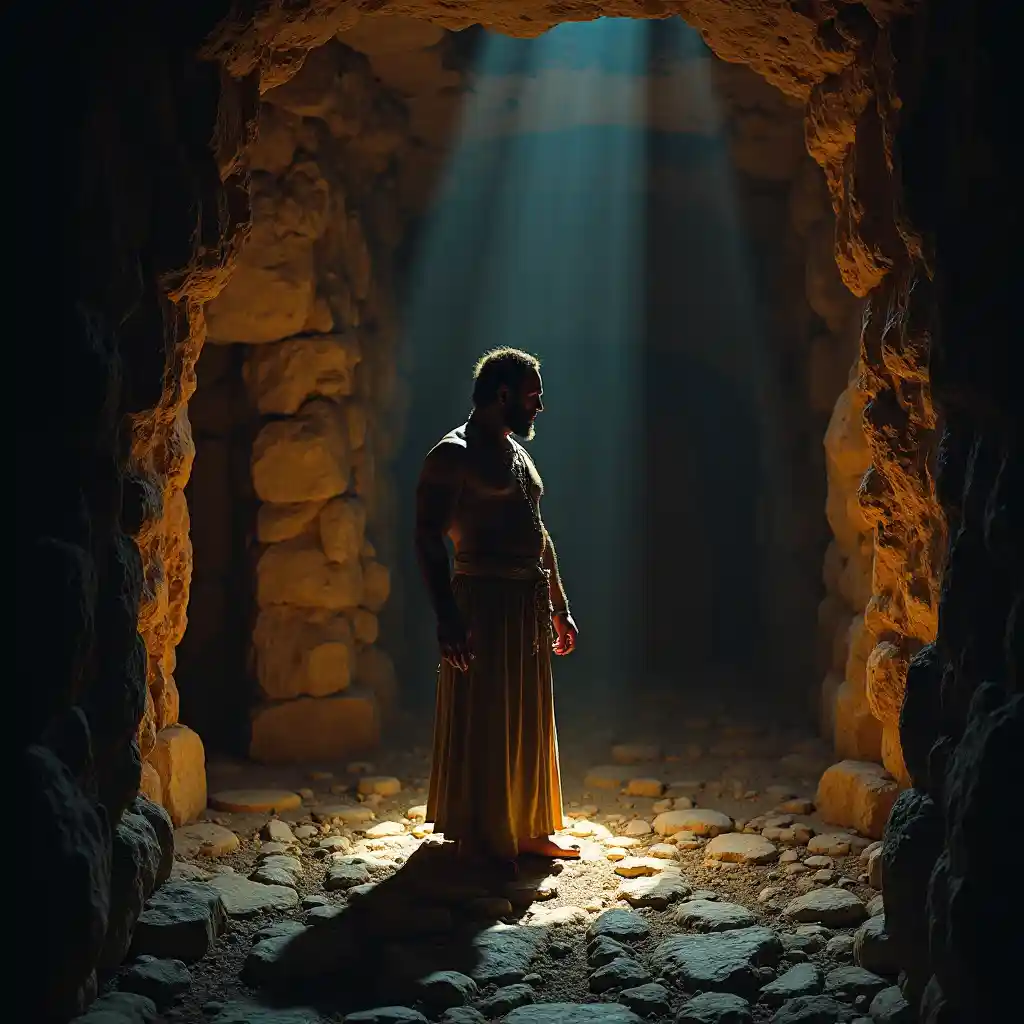 Un chamán prehistórico, en un templo poco iluminado, como gobekli tepe
