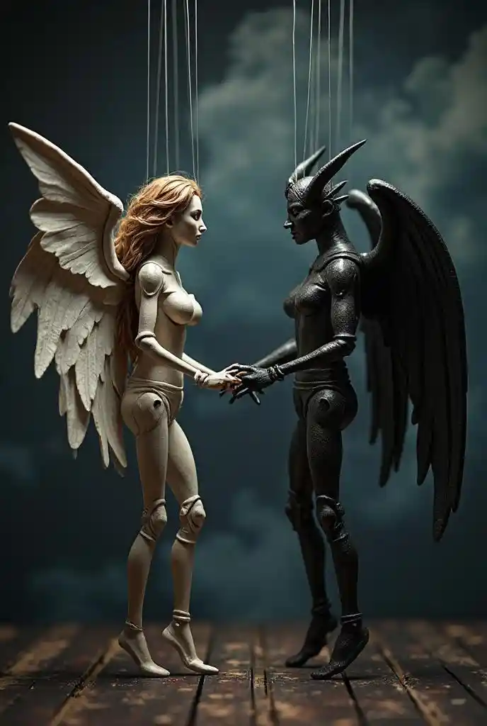 espectáculo de marionetas, marioneta de ángel sexy versus marioneta de demonio sexy, tienen articulaciones intrincadas, ambas tienen alas, cuerdas blancas, mini escenario dramático con nubes oscuras