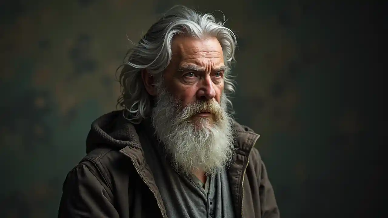 un viejo enojado, ceniza pelo largo, barba, tiro largo