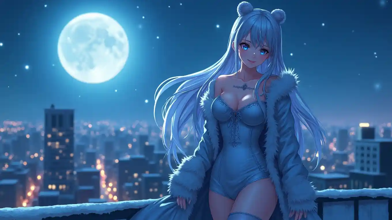 Imagen horizontal a gran escala de una chica anime Ultra HD, increíblemente hermosa y sensual, brillando bajo la luna llena, de pie en una azotea nevada al aire libre con luces de la ciudad debajo, vistiendo un abrigo con ribetes de piel sobre un vestido ajustado con un escote pronunciado y medias hasta los muslos, su cabello largo brillando con escarcha y una sonrisa serena, grandes ojos brillantes, piel brillante, paleta de colores azul helado y plateado, rasgos delicados, maquillaje impecable, vibraciones mágicas y románticas, brillo suave e iluminación ambiental, destacando su voluptuoso, pecho bien definido con un escote sutil, y piernas largas y tonificadas con una postura serena, irradiante belleza y belleza.