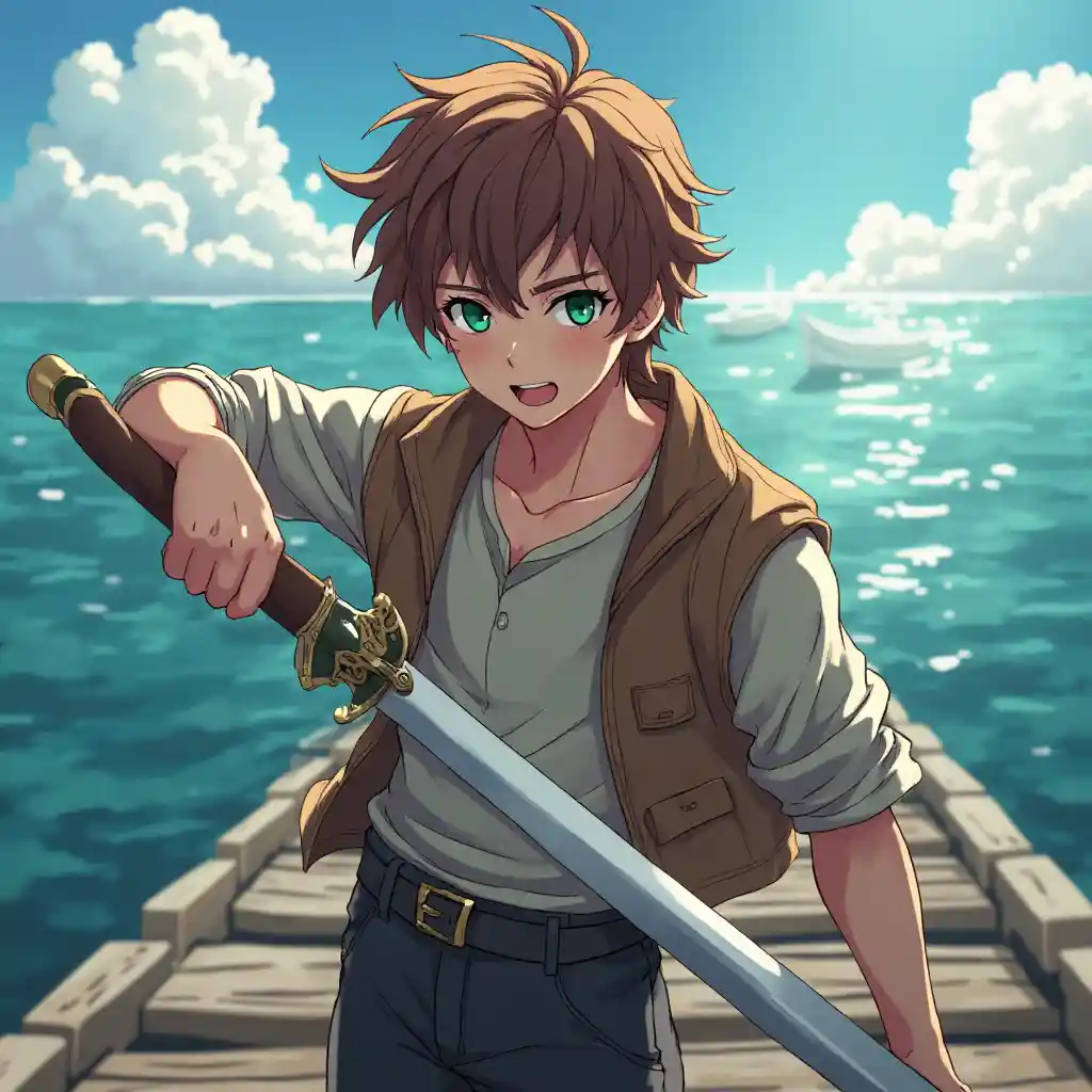 Niño de anime con cabello castaño y ojos verdes sosteniendo una espada en un muelle.