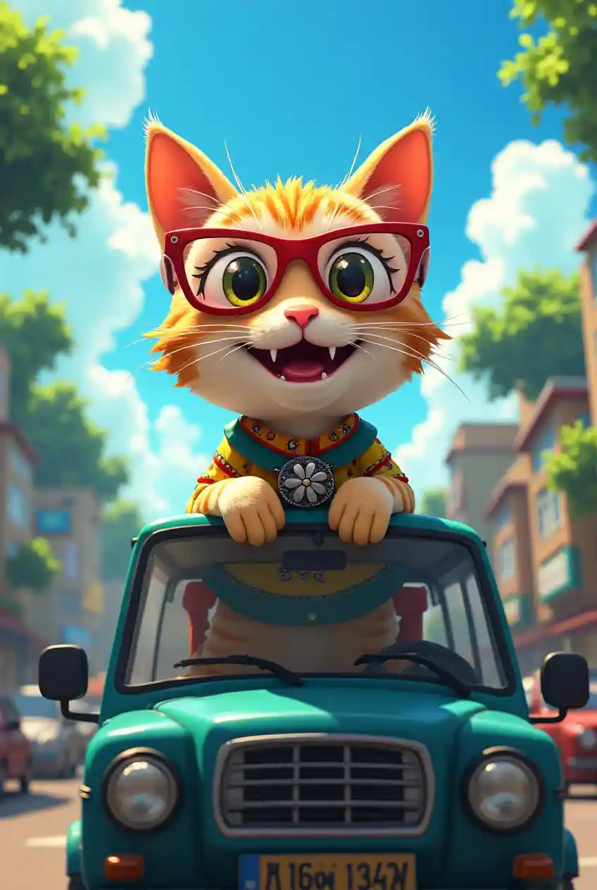 Imagen extremadamente compleja y caótica, perspectiva ultra amplia de ojo de rana, escena dinámica y rápida, composición caótica, detalles en todas partes, lindo gato de anime con ojos grandes, usando anteojos rojos y colgando por la ventana en la parte superior de un SUV. El gato está vestido con una camisa colorida con un cuello estampado y un cinturón negro con una decoración de flores plateadas. El gato tiene una cara sonriente mirando a la cámara, con un fondo verde de árboles con vista a la calle y un cielo azul con nubes blancas. La imagen es de estilo anime, con colores brillantes y alta resolución, altos detalles y arte digital, ambientada en un mundo de fantasía.