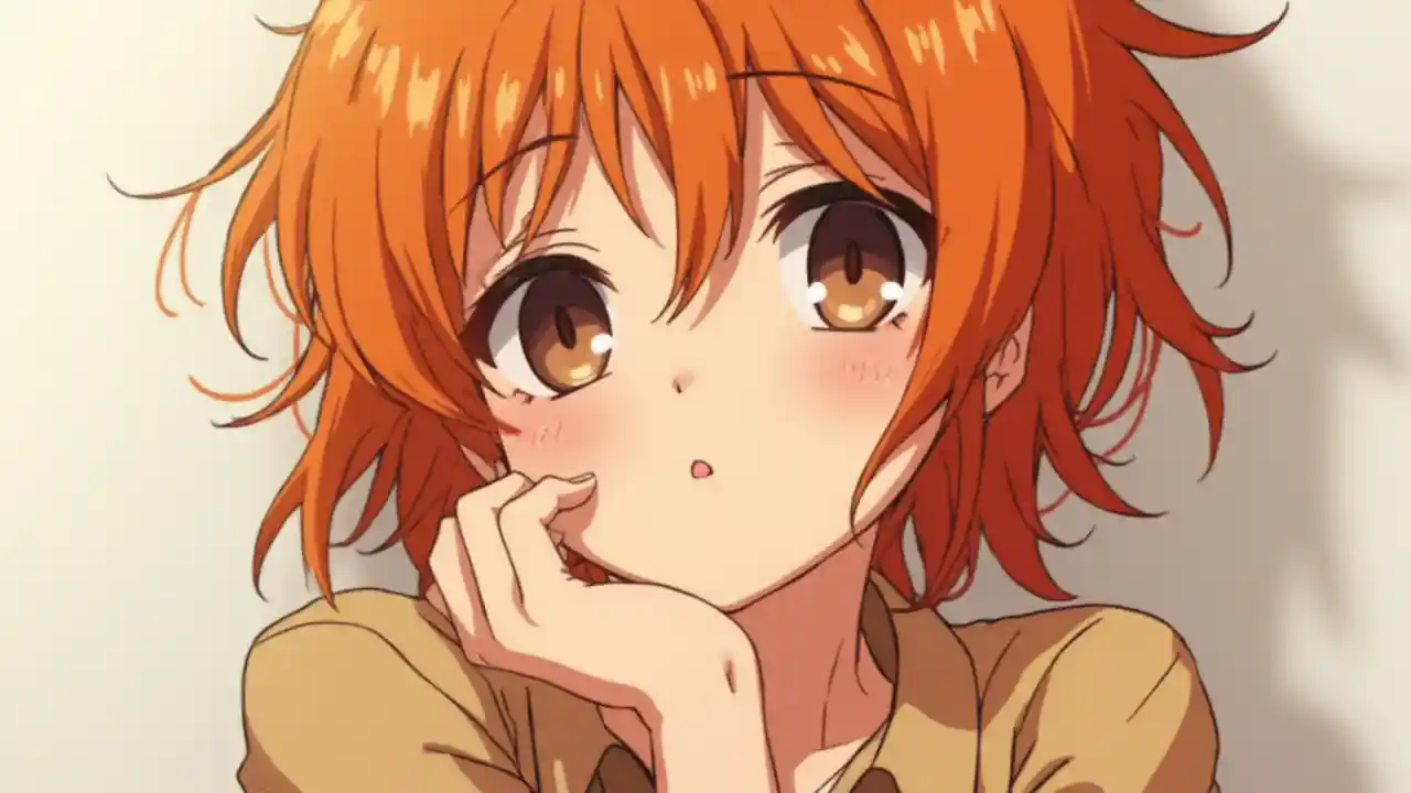 Anime mujer con el pelo naranja desordenado que tiene los ojos marrones oscuros s (e está usando una camisa atada de color arena que tiene la mano en la barbilla como si estuviera aburrida que mira a la izquierda derecha haciendo pucheros en los labios. Cerrar