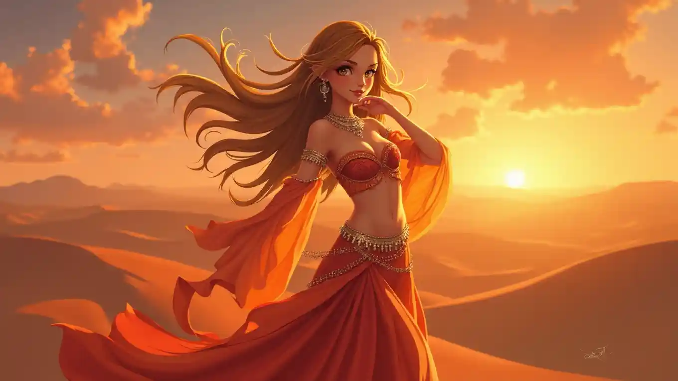 Imagen horizontal a gran escala de una chica anime Ultra HD, encantadoramente hermosa y aventurera, resplandeciente en el crepúsculo, de pie en una duna del desierto al aire libre con una colorida puesta de sol, vistiendo un atuendo de bailarina del vientre que fluye con un escote profundo y un velo transparente, su cabello largo bailando en el viento y una sonrisa cálida, ojos brillantes, piel brillante, cálida paleta de colores dorado y naranja, rasgos suaves, maquillaje perfecto, vibraciones exóticas y aventureras, brillo suave e iluminación natural, acentuando su encantadora, bien definida con un escote sutil en el pecho, y piernas largas y tonificadas con una postura elegante, belleza radiante y mística.