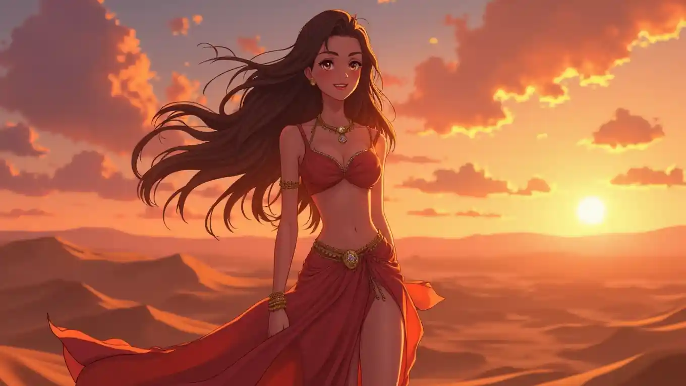Imagen horizontal a gran escala de una chica anime Ultra HD, encantadoramente hermosa y aventurera, resplandeciente en el crepúsculo, de pie en una duna del desierto al aire libre con una colorida puesta de sol, vistiendo un atuendo de bailarina del vientre que fluye con un escote profundo y un velo transparente, su cabello largo bailando en el viento y una sonrisa cálida, ojos brillantes, piel brillante, cálida paleta de colores dorado y naranja, rasgos suaves, maquillaje perfecto, vibraciones exóticas y aventureras, brillo suave e iluminación natural, acentuando su encantadora, bien definida con un escote sutil en el pecho, y piernas largas y tonificadas con una postura elegante, belleza radiante y mística.