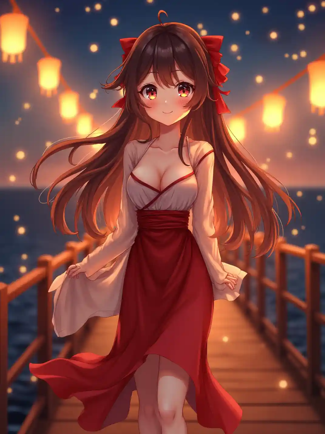 Imagen vertical a gran escala de una chica de anime Ultra HD, encantadoramente hermosa y provocativa, disfrutando del resplandor de un festival de linternas, parada en un muelle junto al mar al aire libre por la noche, vistiendo un hanbok que fluye con un escote profundo y mangas transparentes, su cabello largo que brilla con luz de linterna y una sonrisa cálida, grandes ojos brillantes, piel brillante, suave paleta de colores rojo y naranja, rasgos suaves, maquillaje perfecto, vibraciones festivas y románticas, iluminación cálida con un brillo suave, acentuando su atractivo y bien definido pecho con un sutil escote, y piernas largas y tonificadas con un encanto elegante, exudante y elegancia.