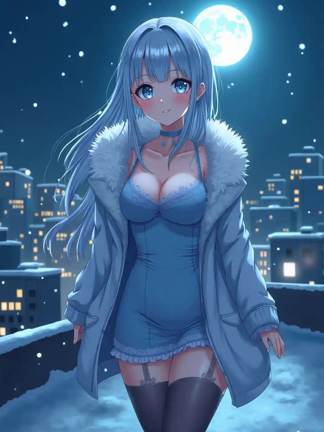 Imagen vertical a gran escala de una chica anime Ultra HD, increíblemente hermosa y sensual, brillando bajo la luna llena, de pie en una azotea nevada al aire libre con luces de la ciudad debajo, vistiendo un abrigo con ribetes de piel sobre un vestido ajustado con un escote pronunciado y medias hasta los muslos, su cabello largo brillando con escarcha y una sonrisa serena, grandes ojos brillantes, piel brillante, paleta de colores azul helado y plateado, rasgos delicados, maquillaje impecable, vibraciones mágicas y románticas, brillo suave e iluminación ambiental, destacando su voluptuoso, pecho bien definido con un sutil escote, y piernas largas y tonificadas con una postura serena, que irradia belleza y mística.