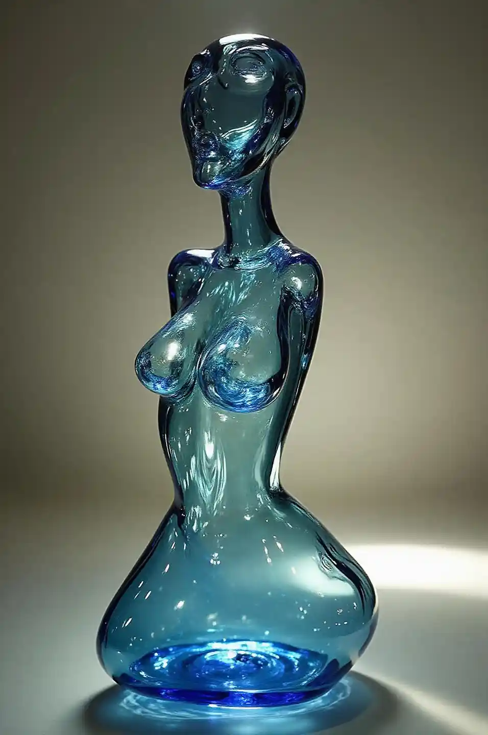 Mejor calidad, hermosas sombras, estilo anime, senos medianos, La escultura de vidrio de una hermosa mujer emite luz e ilumina el entorno, murano _ glass