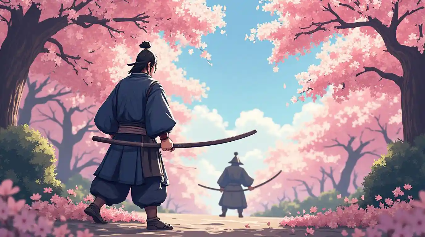AudreyEntrenamiento de samuráis bajo los cerezos en flor, inspirándose en imágenes históricas de anime.