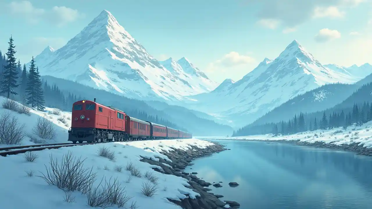 Estilo anime 2d studio Ghibli, un tren se mueve lentamente hacia el espectador a lo largo de la orilla del río, las montañas cubiertas de nieve se elevan en el fondo debajo de un cielo nublado y suave