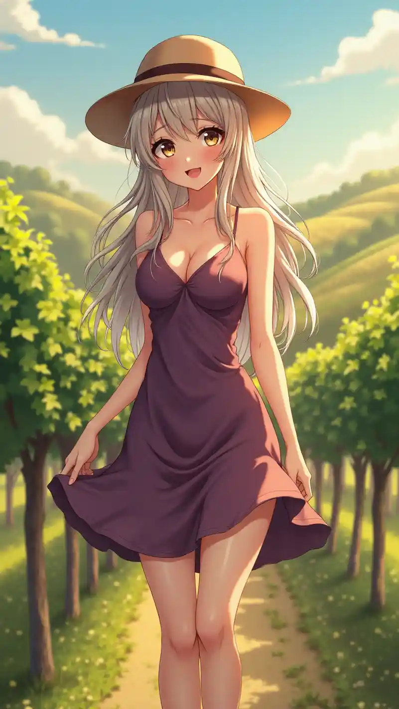 Imagen vertical a gran escala de una chica de anime Ultra HD, sorprendentemente hermosa y seductora, disfrutando de la luz del sol, parada en un viñedo al aire libre con colinas onduladas, vistiendo un vestido de verano elegante con un escote pronunciado y un sombrero de ala ancha, su cabello largo atrapando la luz y una sonrisa radiante, grandes ojos brillantes, piel brillante, cálida paleta de colores púrpura y verde, rasgos afilados, maquillaje perfecto, vibraciones románticas y rústicas, brillo suave e iluminación natural, mostrando su cautivador, pecho bien definido con un escote sutil, y piernas largas y tonificadas con una pose relajada, exudando belleza y encanto.