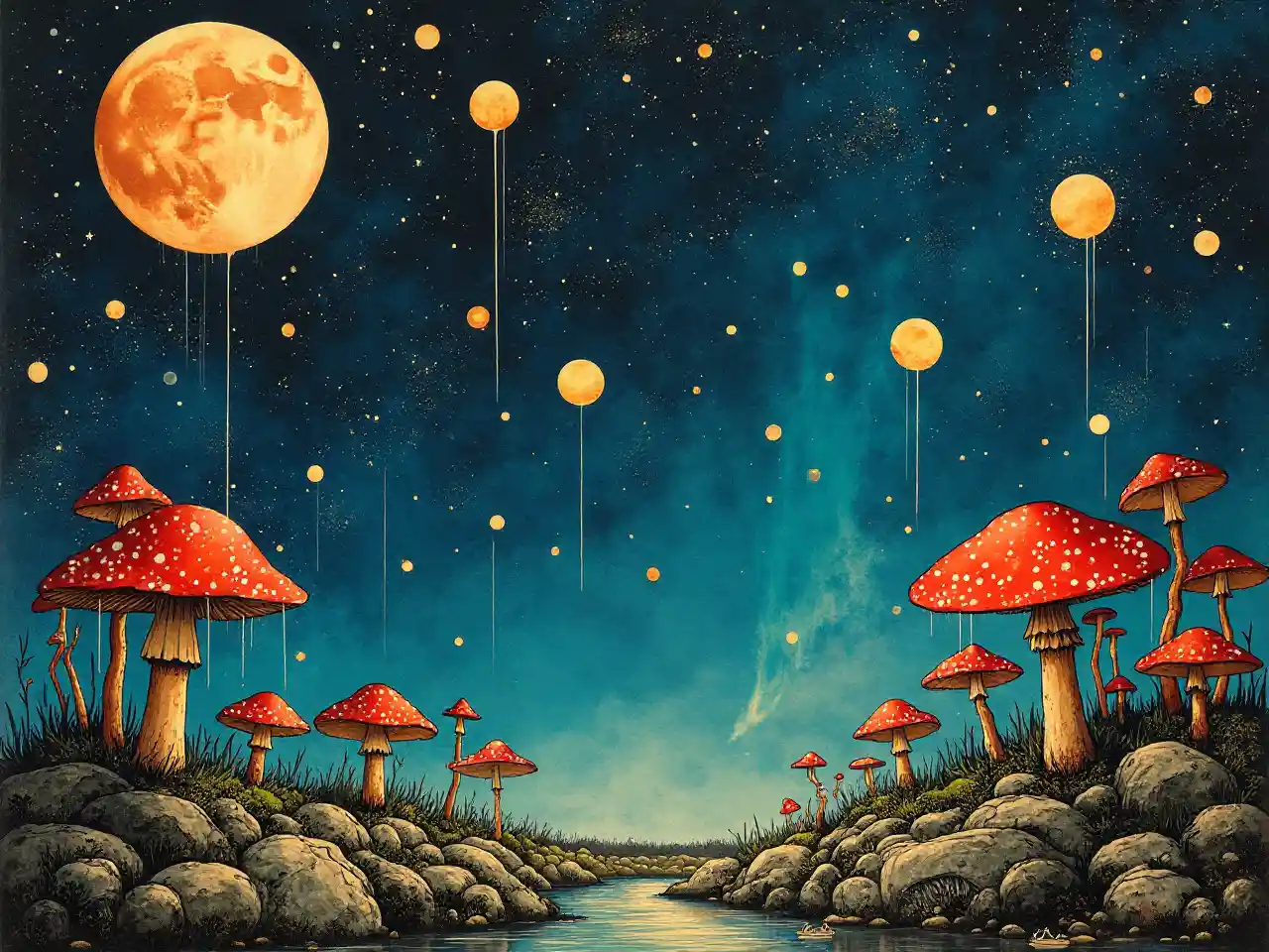 James Jean, Salvador Dalí, Paul Klee, Surrealismo Misterioso Extraño Fantasía Fantástica Ciencia ficción, Anime japonés, Cantando bajo la lluvia de fragmentos de estrellas fugaces, La luna rota, pantano, perspectivas detalladas de obras maestras ángulos altos bajos, nebulosa, Aurora Boreal, musgo hongo