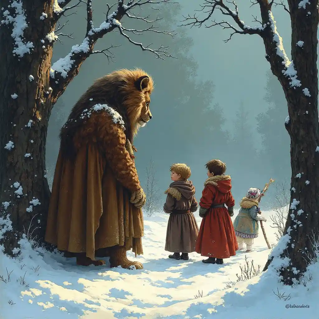 MaverickAslan, del León, la bruja y el armario siendo visitado por tres niños en la nieve en Narnia