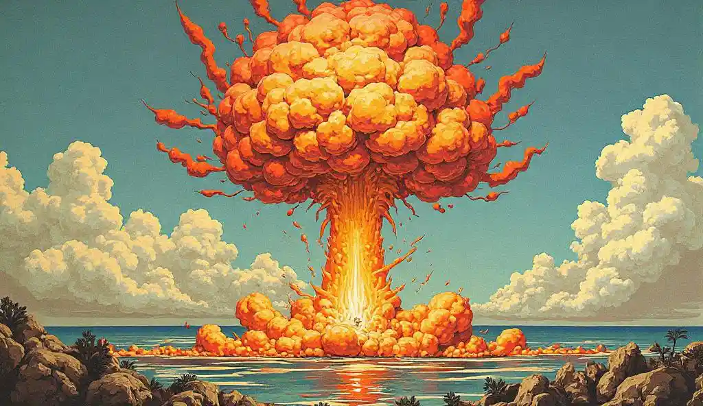 Una detonación nuclear surrealista, completamente elaborada a partir de elementos de collage cortados a mano: la nube de hongo atómico está superpuesta con propagandas militares estadounidenses trituradas de la década de 1960