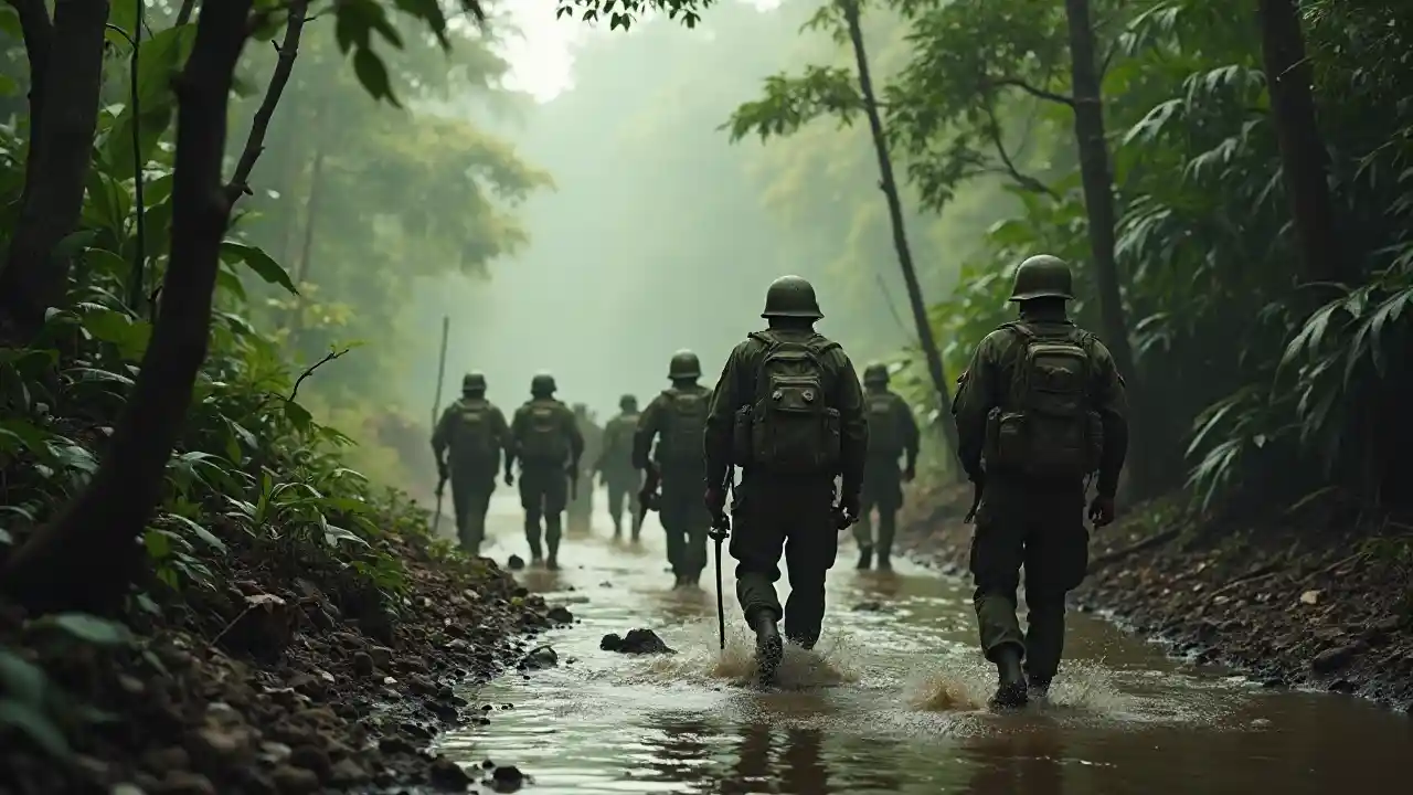 Desde el mar llegaron soldados australianos. Marchando a través de la jungla feroz y fuerte