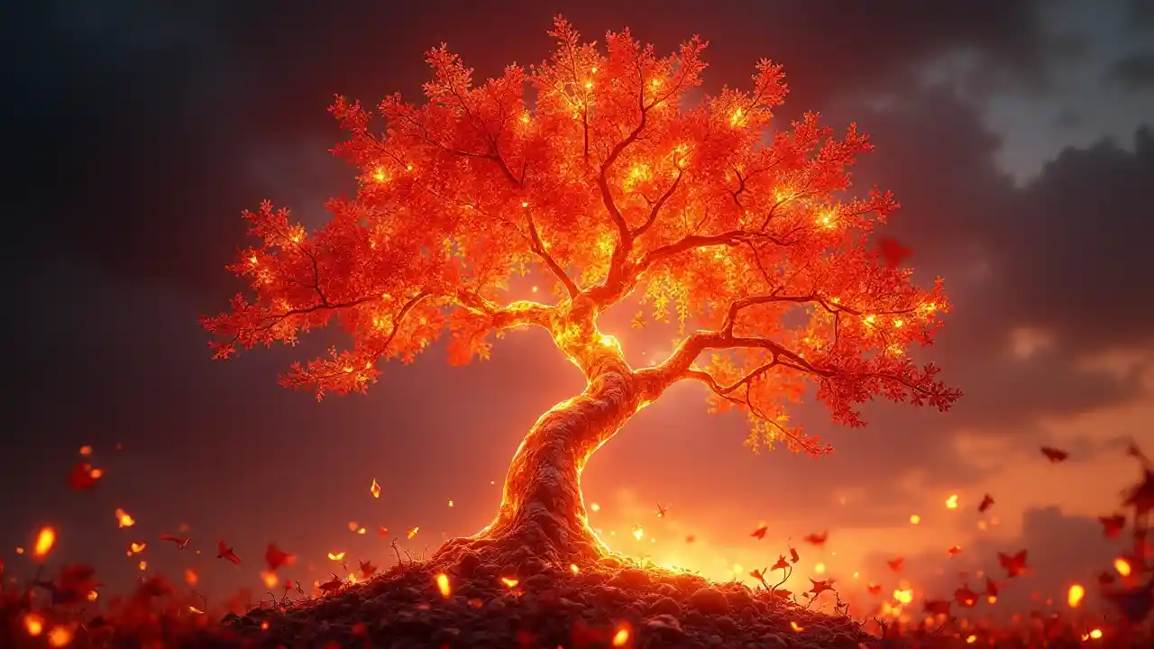Una fusión impresionante de fuego y tristeza otoñal, este retrato captura un árbol de Fusang transparente y radiante, su tronco y ramas similares al vidrio brillando en rojos luminosos, naranjas y ámbar profundo. Todo el árbol brilla desde dentro, como si se forjara a partir de la luz fundida, su transparencia permite que el fondo ardiente sangre a través de su forma. A su alrededor, llamas de vidrio rojo etéreo y transparente parpadean y se retuercen, emitiendo un resplandor de otro mundo. Hojas intrincadamente detalladas, en llamas en carmesí fundido y oro líquido, se deslizan suavemente hacia abajo, cada una ardiendo con la esencia agridulce del otoño. El ambiente es rico en melancolía, un momento congelado entre la belleza y la pérdida. El fondo pulsa con profundos púrpuras crepusculares, naranjas como brasas y tonos carmín ardientes, sumergiendo la escena en un resplandor otoñal de ensueño. Una visión de belleza fugaz y renacimiento, el árbol se erige como fuego y memoria, fundiéndose, brillando, pero eternamente vivo en su triste y vibrante resplandor.