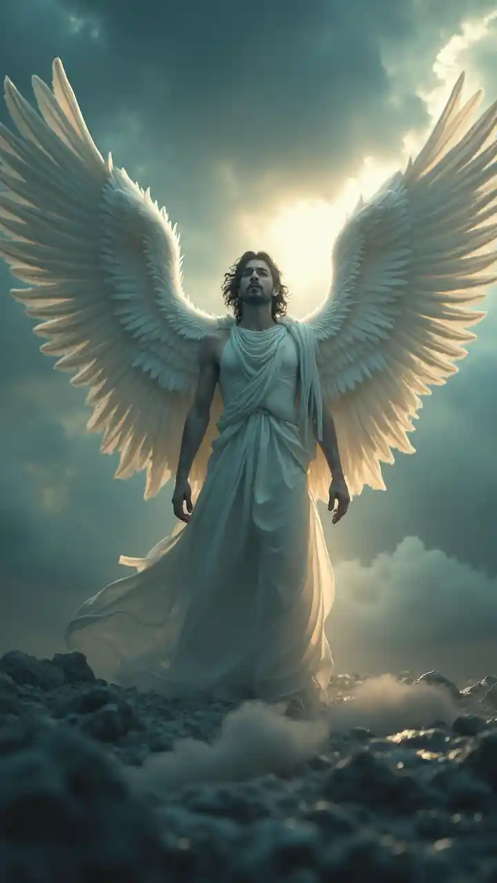Ángel vengador, majestuosas alas extendidas, envueltas en etéreos tonos blancos y plateados, rodeadas de un aura de venganza. Luz etérea que brilla a través de oscuros cielos tormentosos en el fondo, creando un contraste cautivador. Expresión poderosa, postura equilibrada, con determinación que irradia de la figura. 4K ultra-detallada, atmósfera cinematográfica que invoca asombro e intensidad.