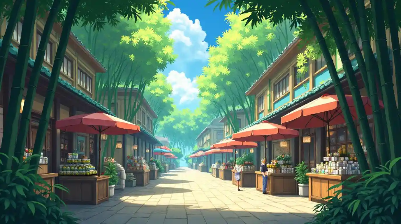 EleanorVibrant marketplace in the heart of a bamboo forest, influenced by traditional anime aesthetics.